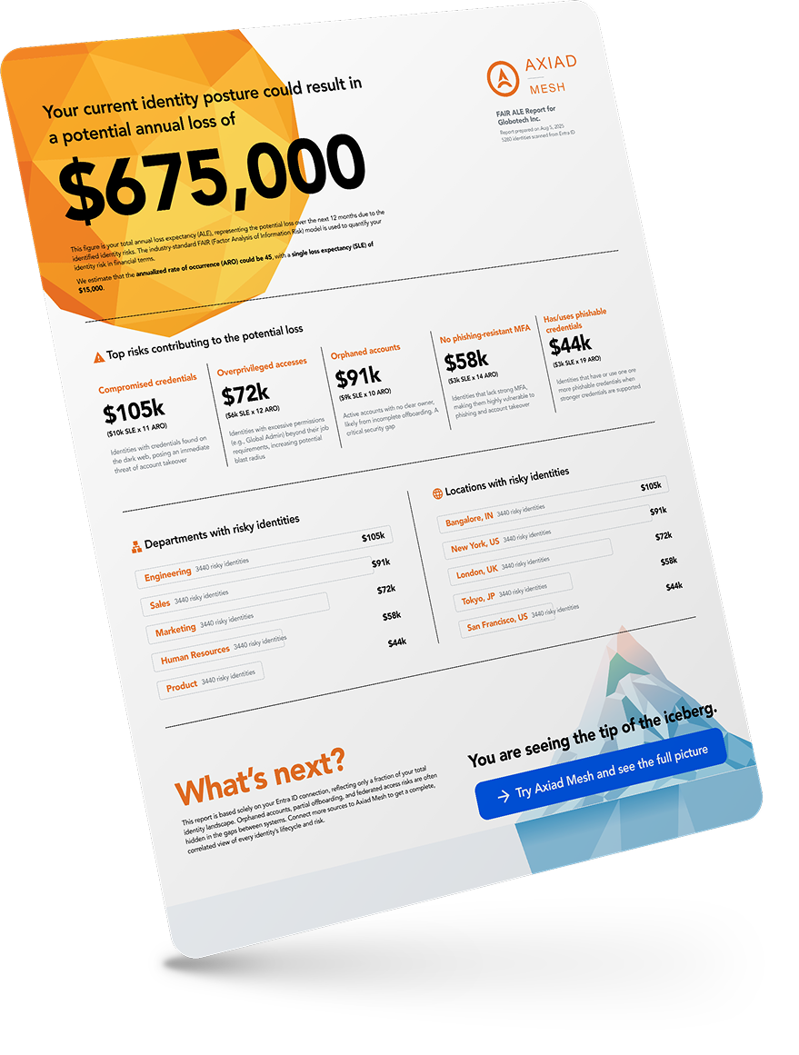 See your identity risk quantified in financial terms. Axiad Mesh will analyze your environment and deliver a comprehensive FAIR assessment showing probable loss exposure, risk prioritization, and investment recommendations—at no cost.